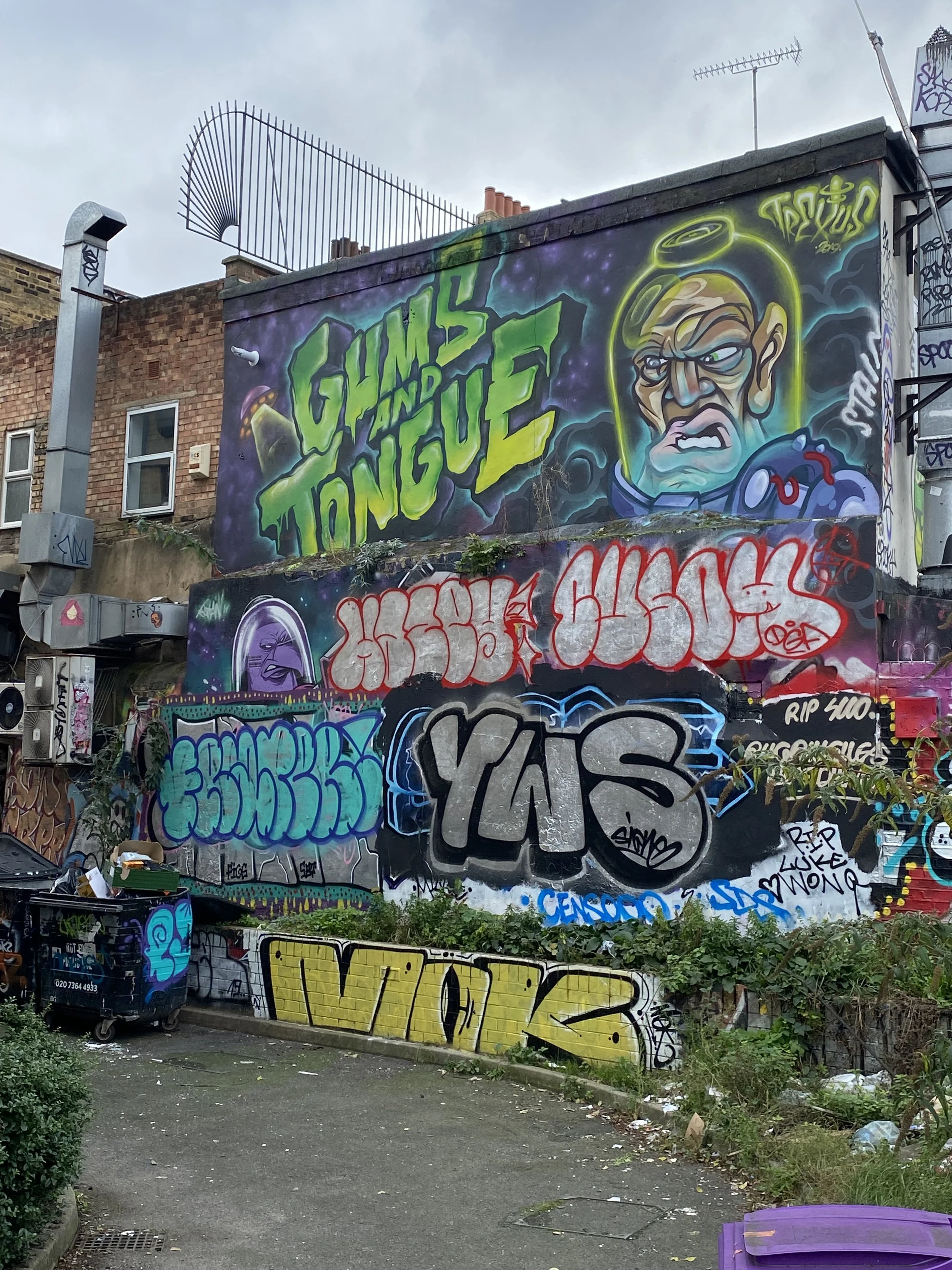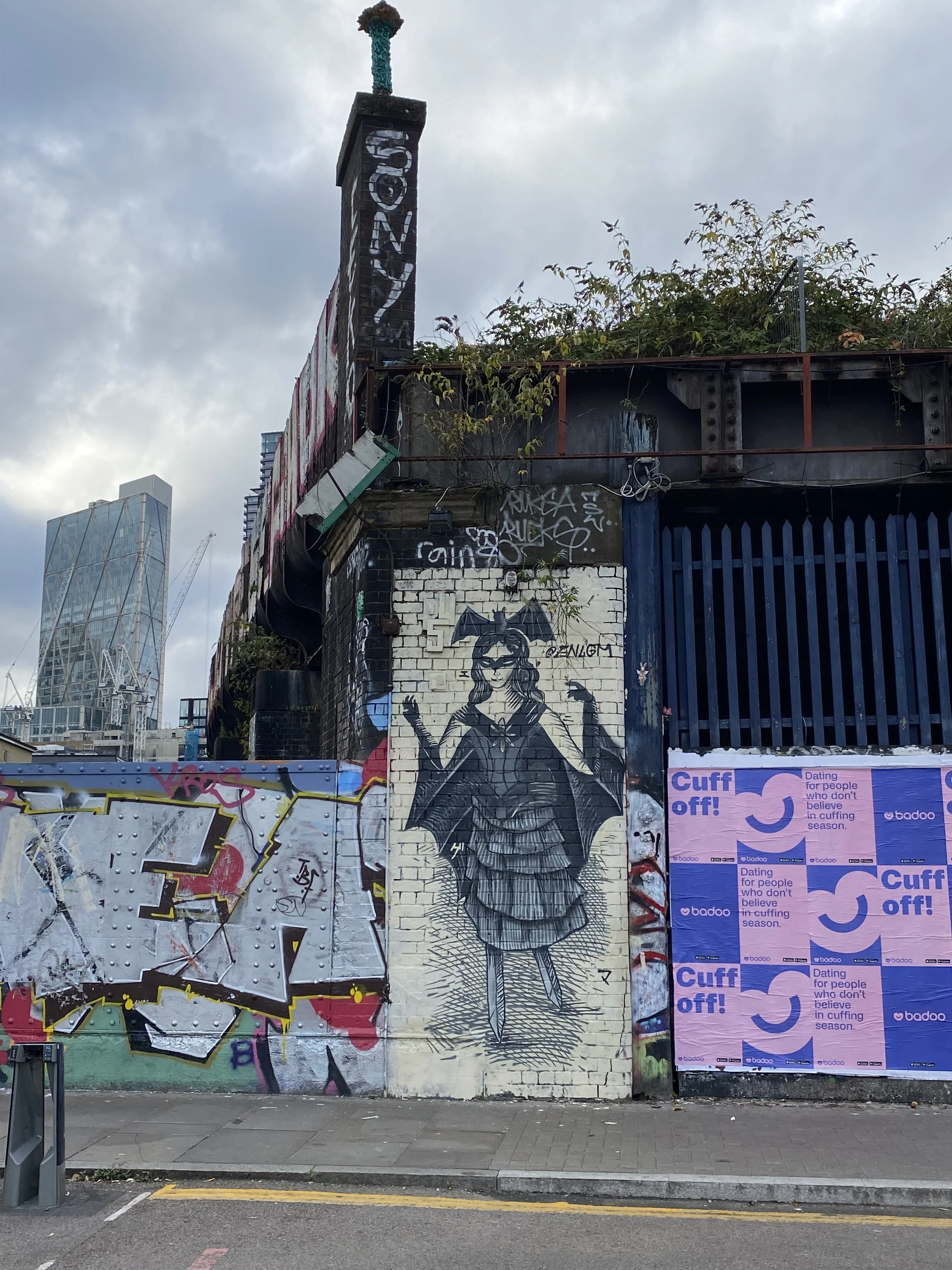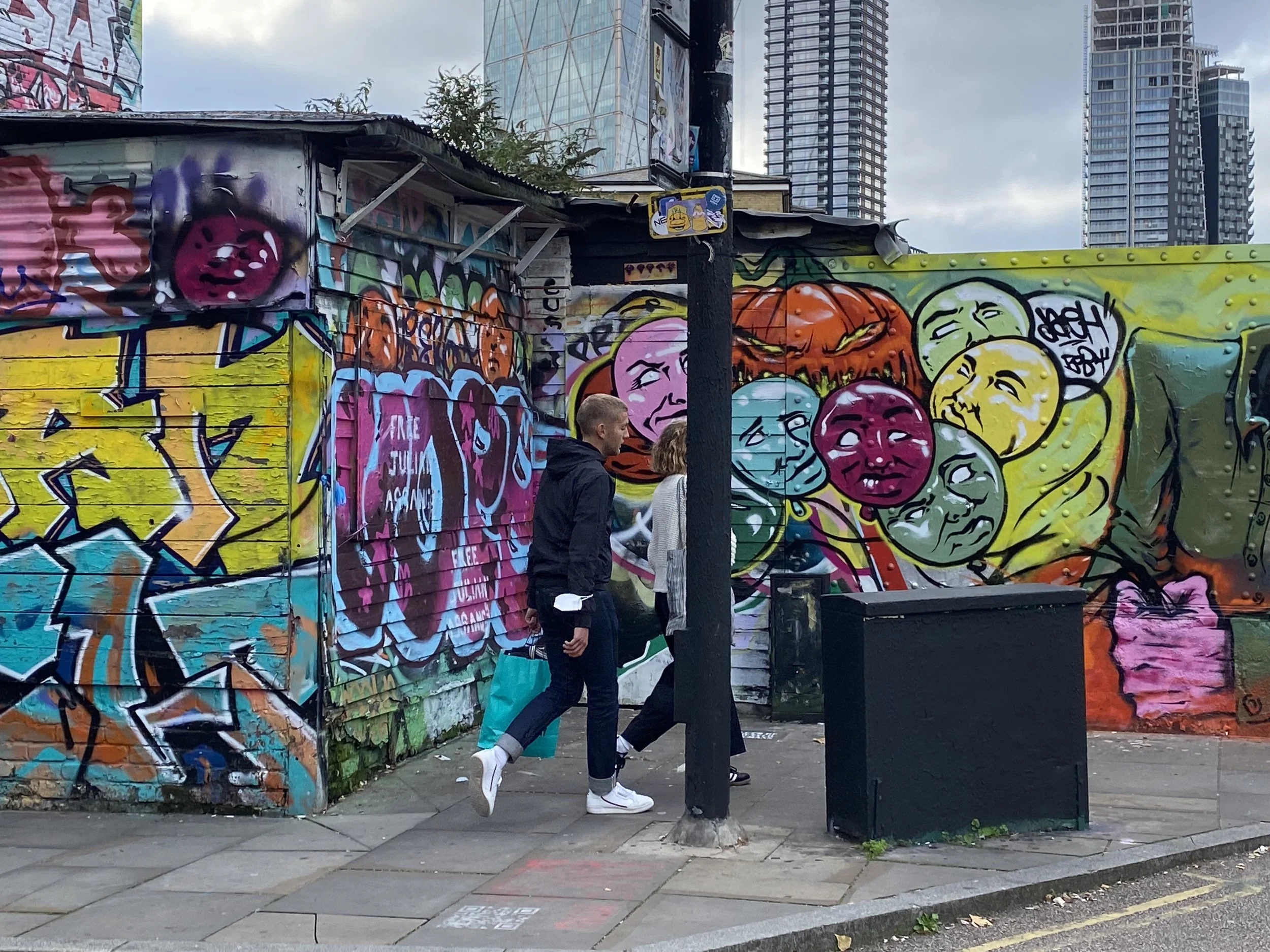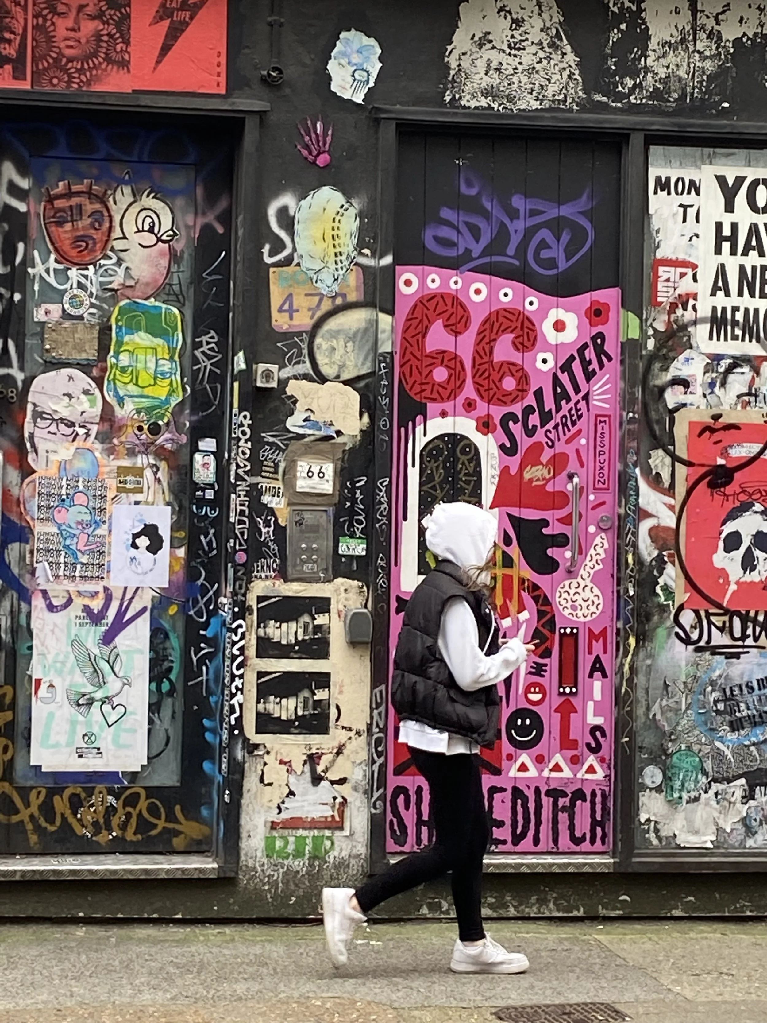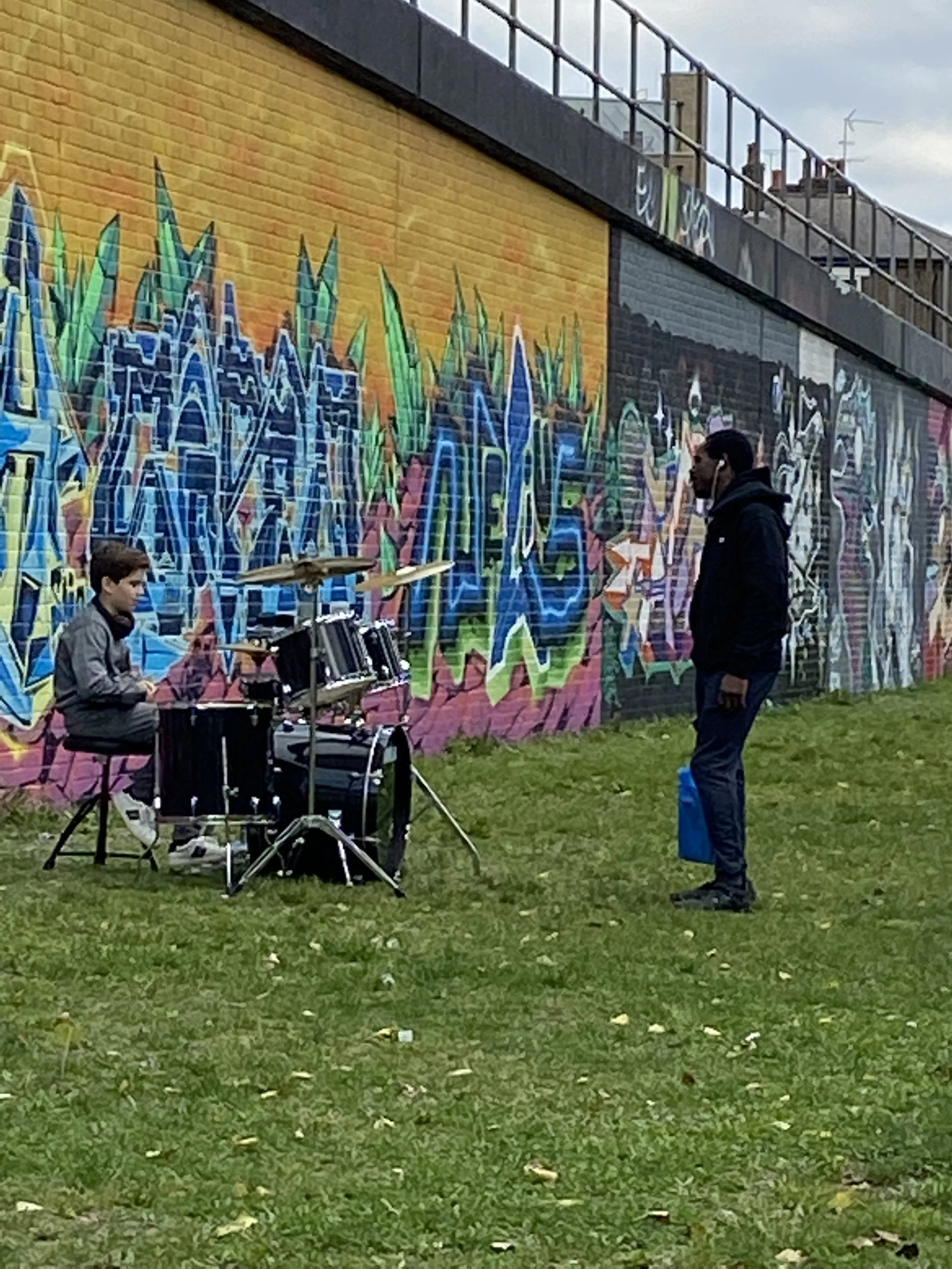 I love graffiti and I’m not really sure what it is that pulls me in, be it the colour, the vastness and there size of it or simply the clean graphic and repeat in pattern. It’s not always that way, sometimes it’s layered and old, peeling away histories and stories of what was before. Walking around London E1, Brick Lane and Shoreditch, with my daughter and her boyfriend. On her 14th birthday I took photos of her with graffiti that became the the inspiration for my #LibertyOpenCall winning painting. Now three years on she’s taking the photo’s, portraits. Except I can’t help myself either - I’m not just going to hang around. I feel that same energy of capturing a moment, back in the day I was traveling worldwide. I constantly see frozen moments captured in time, compositions and interactions. This time I let it pass, she has the camera, I have the phone. Instead I stick with the wall and enjoy what East London has to offer. My favourite moment walking into a park by the railway tracks, surrounded wall to wall with tags and in front a boy of 10 plays his drums out on the grass.