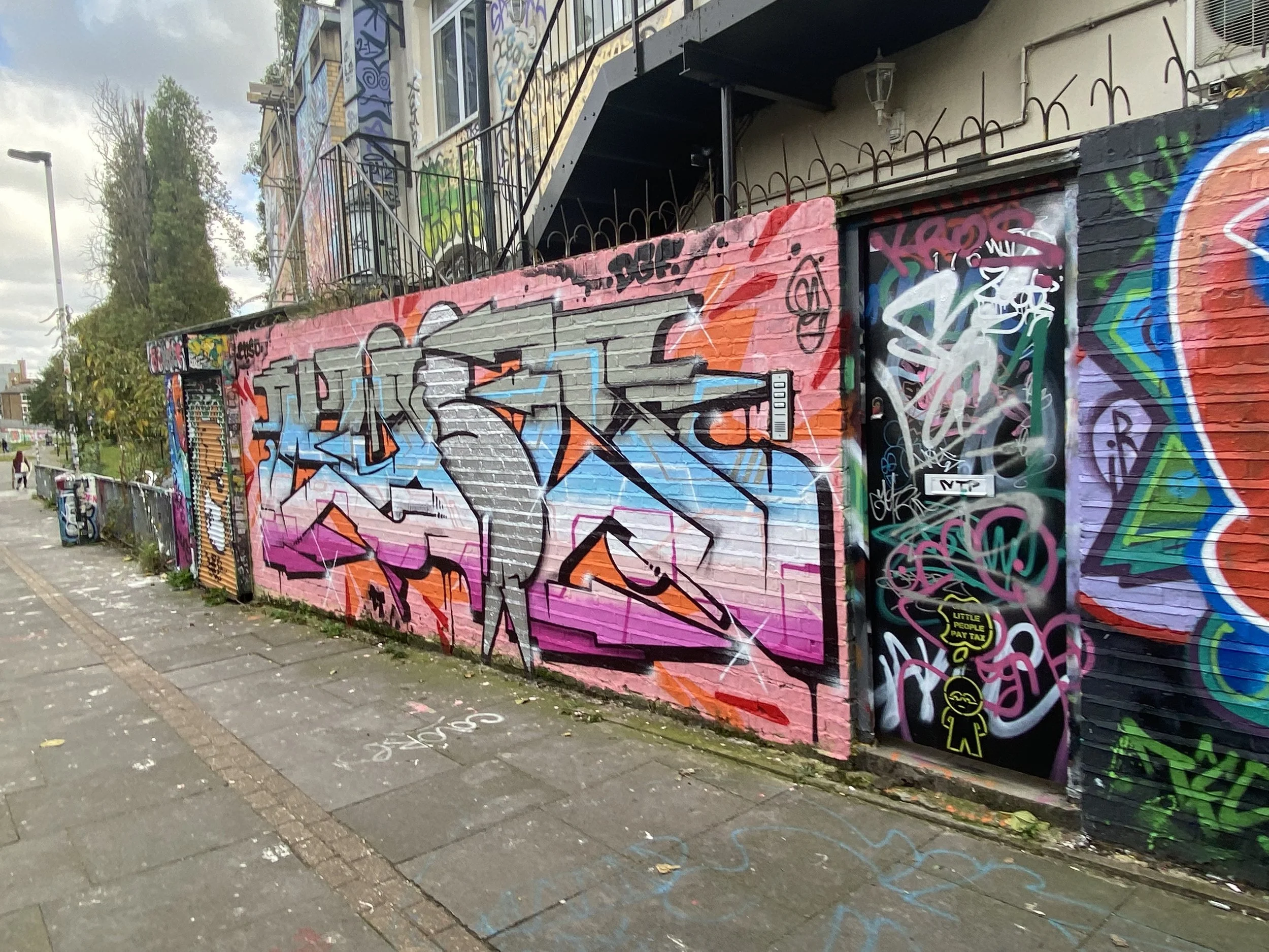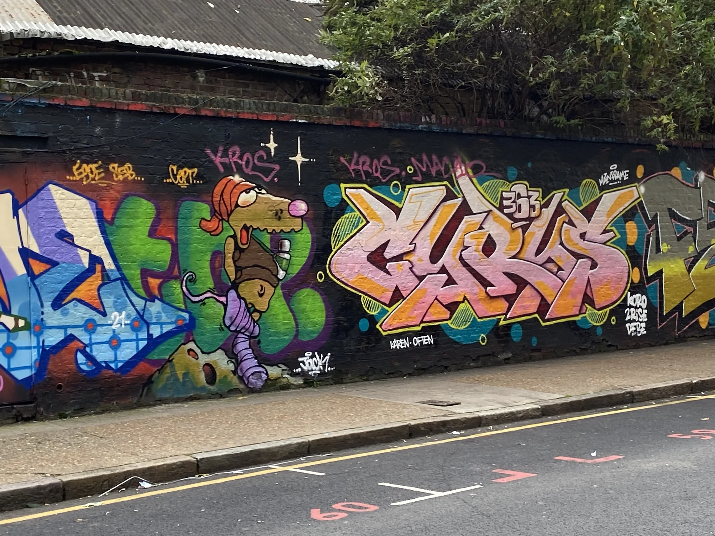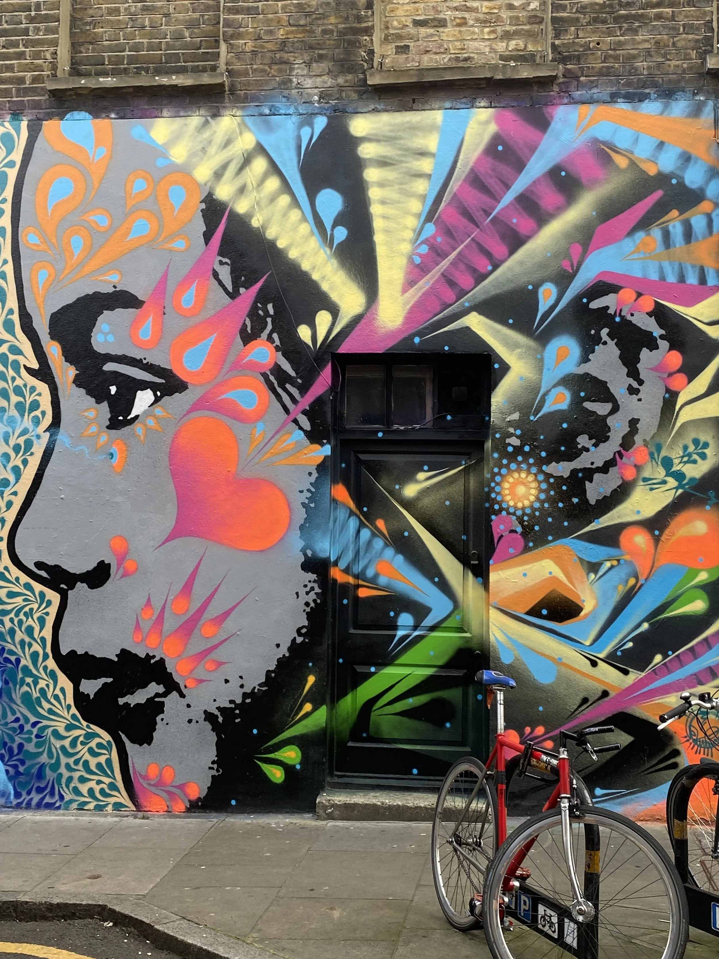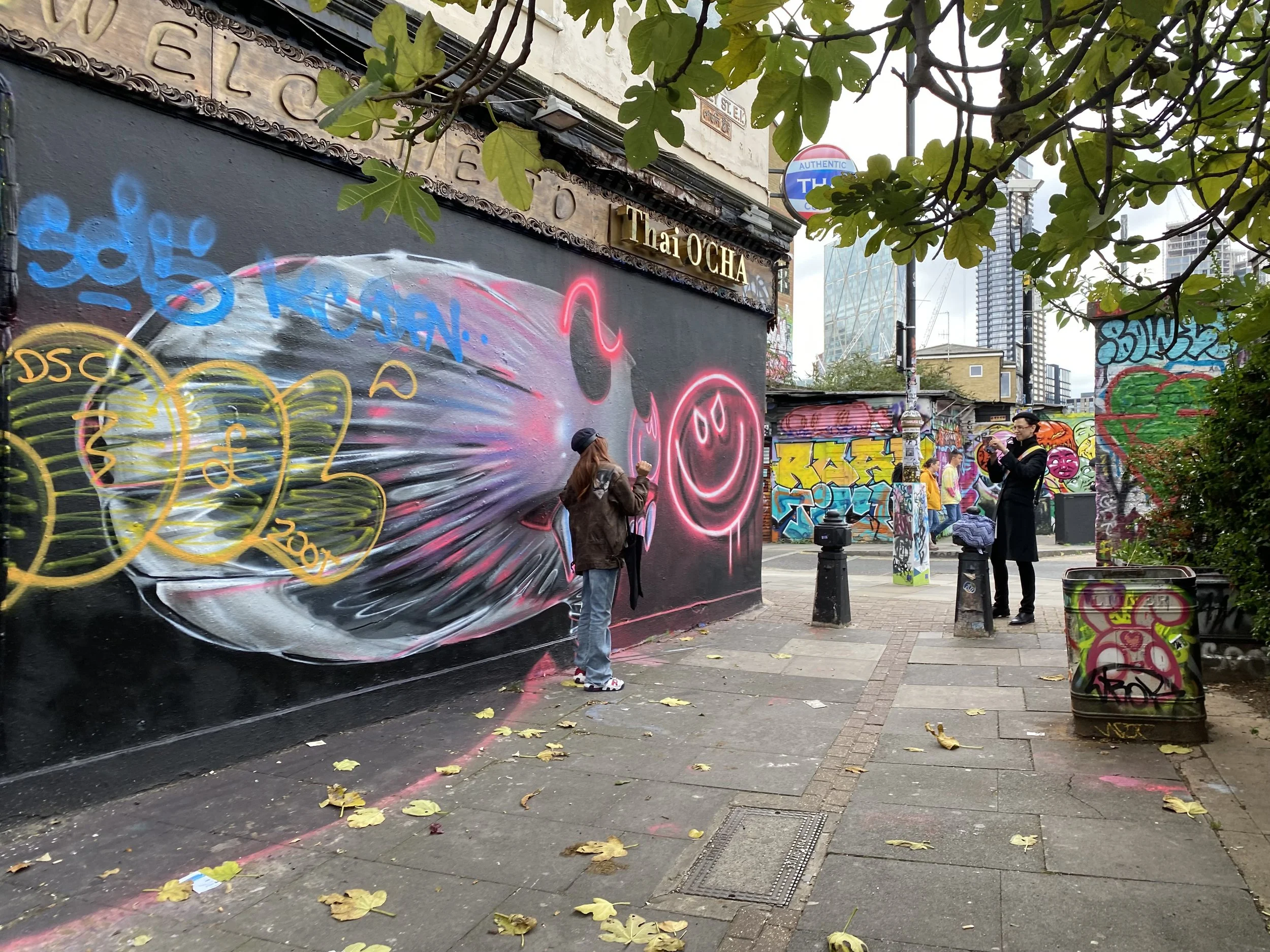 I love graffiti and I’m not really sure what it is that pulls me in, be it the colour, the vastness and there size of it or simply the clean graphic and repeat in pattern. It’s not always that way, sometimes it’s layered and old, peeling away histories and stories of what was before. Walking around London E1, Brick Lane and Shoreditch, with my daughter and her boyfriend. On her 14th birthday I took photos of her with graffiti that became the the inspiration for my #LibertyOpenCall winning painting. Now three years on she’s taking the photo’s, portraits. Except I can’t help myself either - I’m not just going to hang around. I feel that same energy of capturing a moment, back in the day I was traveling worldwide. I constantly see frozen moments captured in time, compositions and interactions. This time I let it pass, she has the camera, I have the phone. Instead I stick with the wall and enjoy what East London has to offer. My favourite moment walking into a park by the railway tracks, surrounded wall to wall with tags and in front a boy of 10 plays his drums out on the grass.