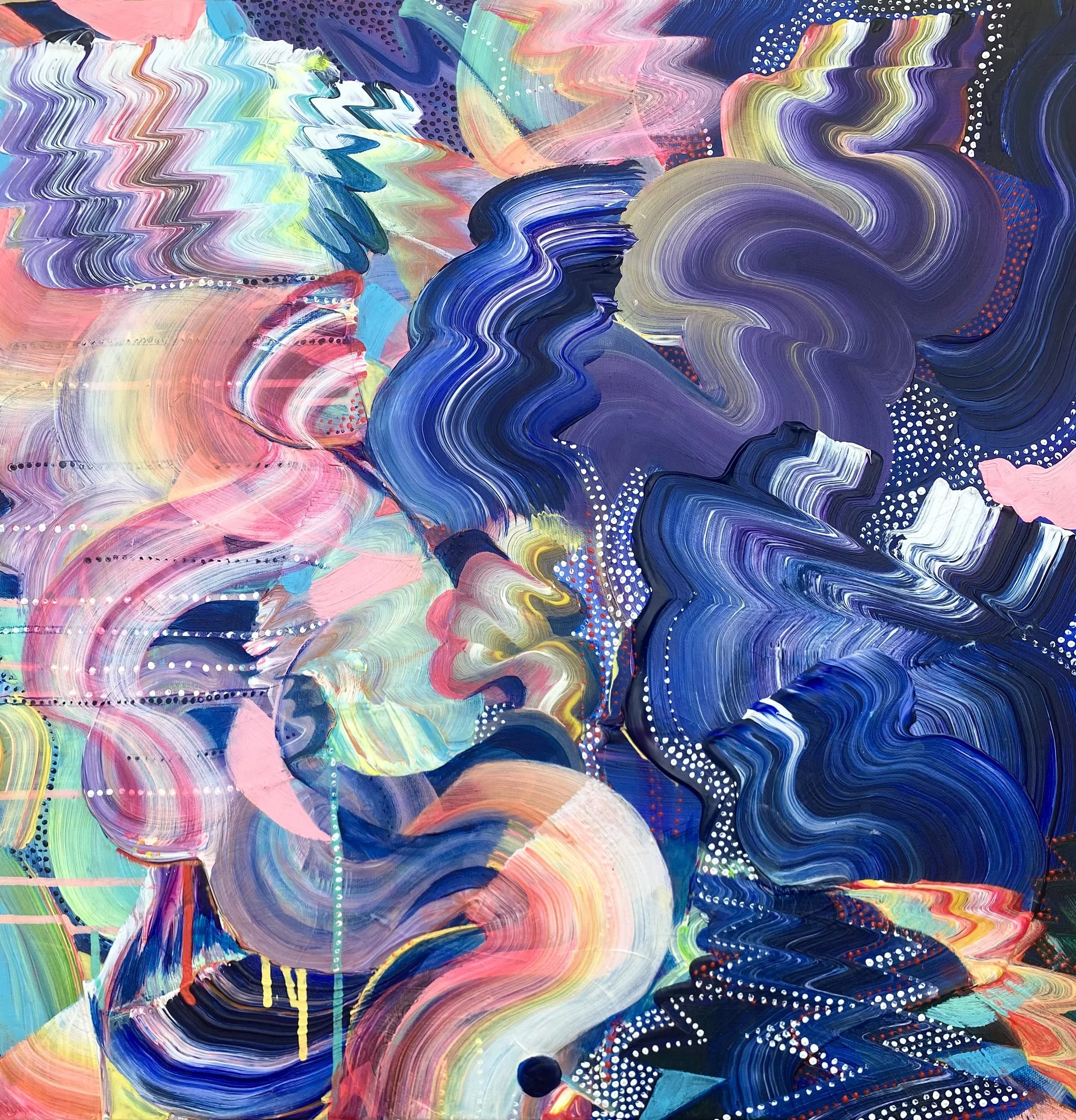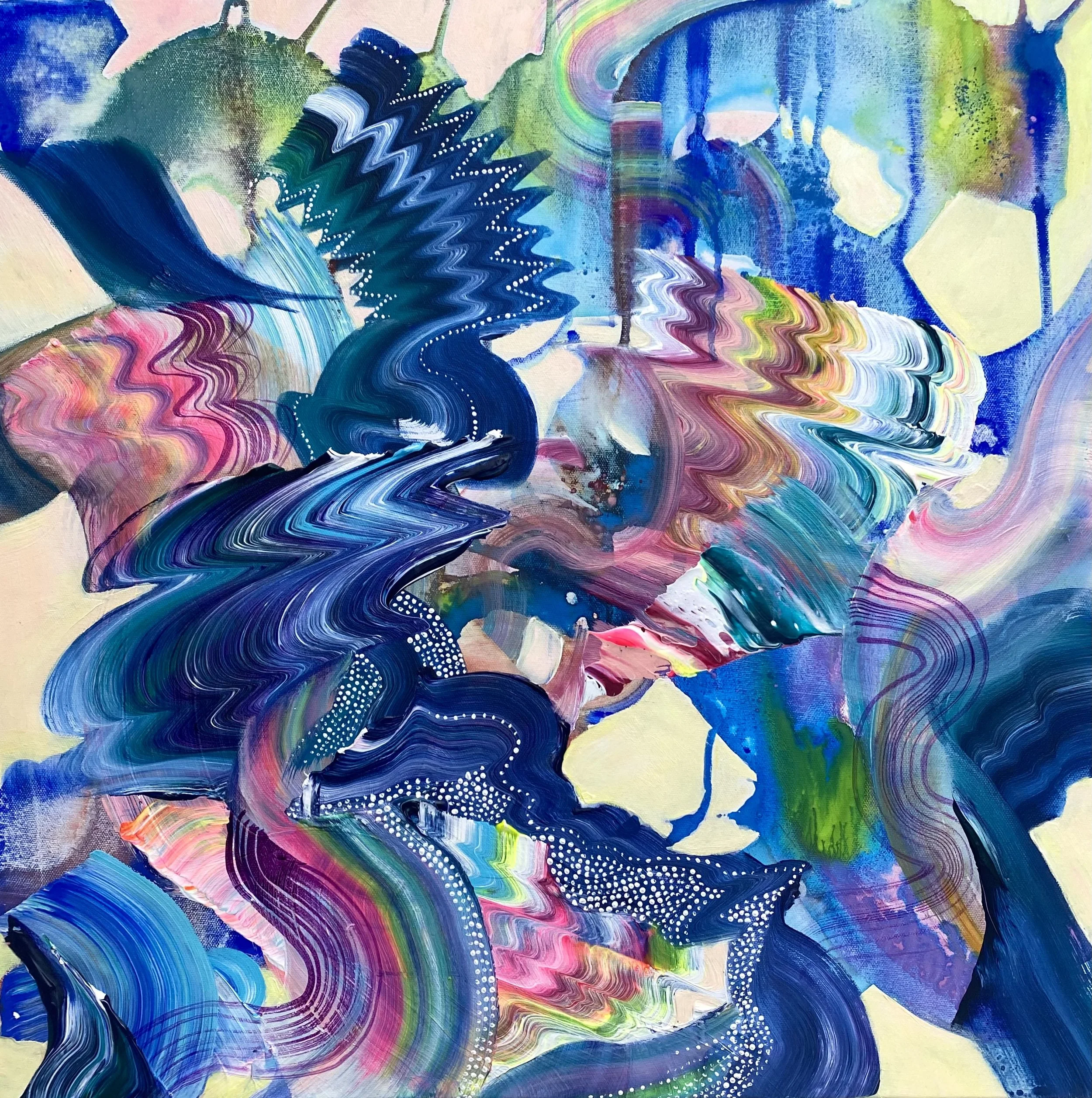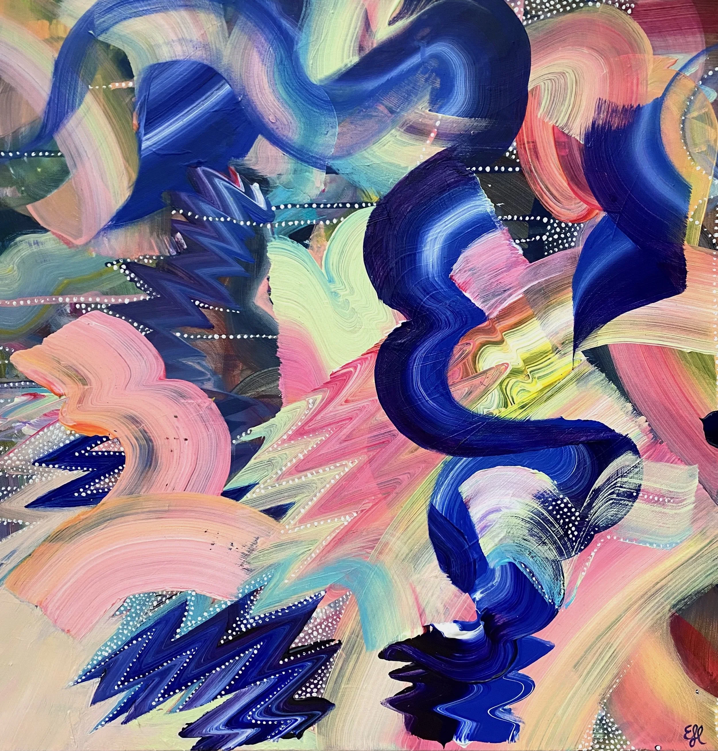 "My paintings are about feeling. They are maps, inner landscapes of light, color, and energy, vibrating on a higher frequency, sharing love and joy, uniting and connecting. They are a dance of differences, with swoops and swaths of color flowing rhythmically, like the highs and lows of a zigzag. They represent our hearts beating, excited and alive, the connection between mind, body, and soul."